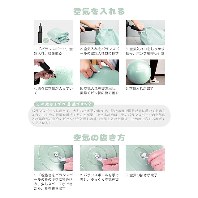 【多目的利用】 バランスボールは、楽しみながらエクササイズできる道具として人気があります。オフィスチェアとして姿勢改善に、ヨガやピラティスのトレーニングボールとしても活用できます。また、リハビリや回復、産後ケアにも役立ち、ストレス軽減や心身の健康促進に寄与します。