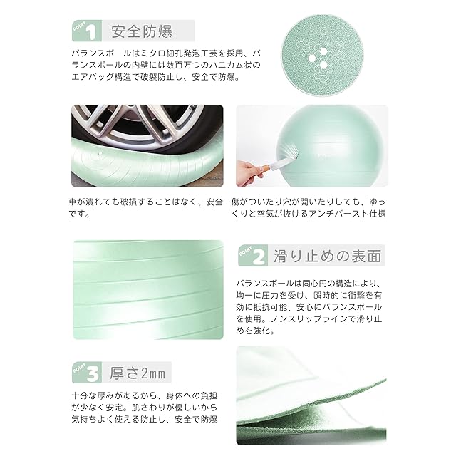 【SGS認証取得】 バランスボールは3サイズ(55cm: 1kg、65cm: 1.2kg、75cm: 1.4kg)があり、ほとんどの市場の製品よりも重く設計されています。荷重耐性は300kgで、滑り止め機能と真の爆発防止性を備え、安全にご使用いただけます。
