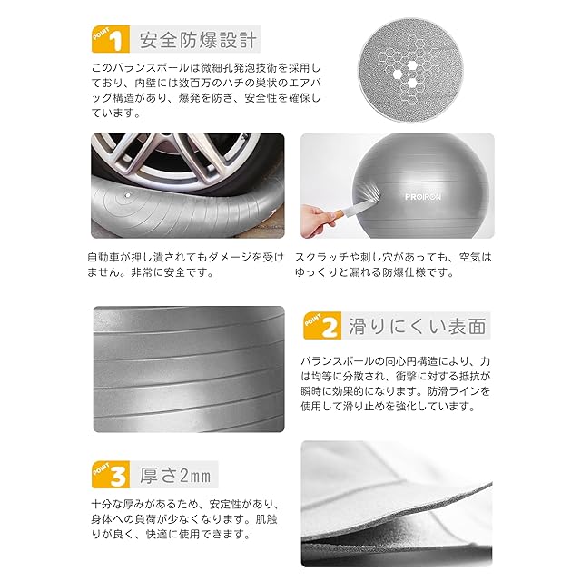 【高品質で耐久性のある素材】 PROIRONのバランスボールは、高品質な2mm厚のPVCで作られ、耐久性と快適性を兼ね備えています。6色のスタイリッシュなカラーから選ぶことができます。また、使用しやすいハンドポンプも同梱されています。空気充填方法や選択肢については、写真をご参照ください。