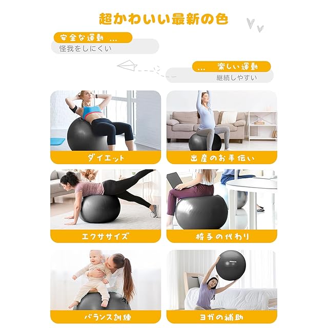 【多目的利用】 バランスボールは、楽しみながらエクササイズできる道具として人気があります。オフィスチェアとして姿勢改善に、ヨガやピラティスのトレーニングボールとしても活用できます。また、リハビリや回復、産後ケアにも役立ち、ストレス軽減や心身の健康促進に寄与します。