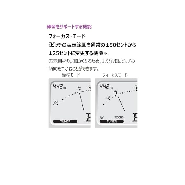 練習をサポートする「サウンドバック(聴く力と合わせる力を養う)」「トラック(チューナーに頼らず安定したピッチを目指す)」「フォーカス(より鮮明にピッチの傾向をつかむ)」各種モード付き。