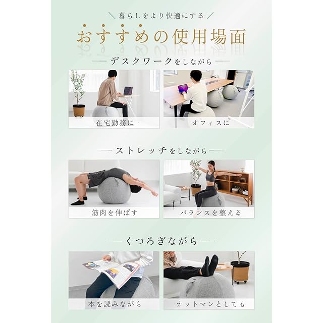 【インテリアに馴染むデザイン】 普通のバランスボールとは違い、カバーがついているため、インテリアやオフィスにも馴染みます。おしゃれな部屋にこだわっている方におすすめです。