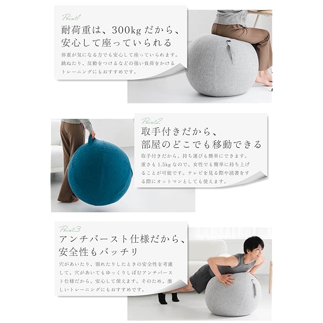 ※空気を入れる際の注意事項 ボールを膨らませている際、これ以上膨らまないと感じても、空気を入れ続けることで規定のサイズに膨らみます。カバーに張りが出るくらいを目安に、空気を入れてください。 【キレイな姿勢が自然と手に入る】 バランスボールに座ることで普段使わない筋肉が刺激されるので、筋肉のバランスが整います。体の各部位の歪みが解消され、姿勢改善などの効果が期待できます。 【インテリアに馴染むデザイン】 普通のバランスボールとは違い、カバーがついているため、インテリアやオフィスにも馴染みます。おしゃれな部屋にこだわっている方におすすめです。 【取手付きだから移動が簡単】 取手付きだから、持ち運びも簡単です。重さも1500gなので、女性でも簡単に持ち上げることが可能です。 【耐久性抜群】 uFit Balance Ballは、耐荷重300kgの丈夫な設計。跳ねたり、反動をつけるなどの強い負荷をかけるトレーニングにもおすすめです。