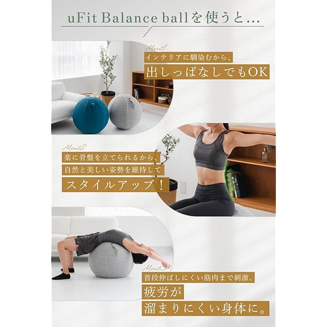※空気を入れる際の注意事項 ボールを膨らませている際、これ以上膨らまないと感じても、空気を入れ続けることで規定のサイズに膨らみます。カバーに張りが出るくらいを目安に、空気を入れてください。 【キレイな姿勢が自然と手に入る】 バランスボールに座ることで普段使わない筋肉が刺激されるので、筋肉のバランスが整います。体の各部位の歪みが解消され、姿勢改善などの効果が期待できます。 【インテリアに馴染むデザイン】 普通のバランスボールとは違い、カバーがついているため、インテリアやオフィスにも馴染みます。おしゃれな部屋にこだわっている方におすすめです。 【取手付きだから移動が簡単】 取手付きだから、持ち運びも簡単です。重さも1500gなので、女性でも簡単に持ち上げることが可能です。 【耐久性抜群】 uFit Balance Ballは、耐荷重300kgの丈夫な設計。跳ねたり、反動をつけるなどの強い負荷をかけるトレーニングにもおすすめです。