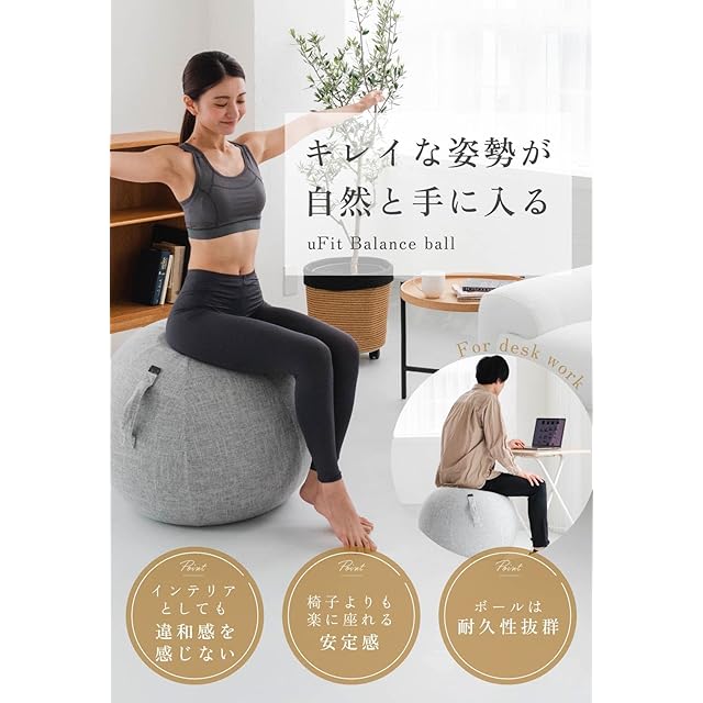 ※空気を入れる際の注意事項 ボールを膨らませている際、これ以上膨らまないと感じても、空気を入れ続けることで規定のサイズに膨らみます。カバーに張りが出るくらいを目安に、空気を入れてください。 【キレイな姿勢が自然と手に入る】 バランスボールに座ることで普段使わない筋肉が刺激されるので、筋肉のバランスが整います。体の各部位の歪みが解消され、姿勢改善などの効果が期待できます。 【インテリアに馴染むデザイン】 普通のバランスボールとは違い、カバーがついているため、インテリアやオフィスにも馴染みます。おしゃれな部屋にこだわっている方におすすめです。 【取手付きだから移動が簡単】 取手付きだから、持ち運びも簡単です。重さも1500gなので、女性でも簡単に持ち上げることが可能です。 【耐久性抜群】 uFit Balance Ballは、耐荷重300kgの丈夫な設計。跳ねたり、反動をつけるなどの強い負荷をかけるトレーニングにもおすすめです。