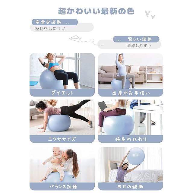 【多目的利用】 バランスボールは、楽しみながらエクササイズできる道具として人気があります。オフィスチェアとして姿勢改善に、ヨガやピラティスのトレーニングボールとしても活用できます。また、リハビリや回復、産後ケアにも役立ち、ストレス軽減や心身の健康促進に寄与します。
