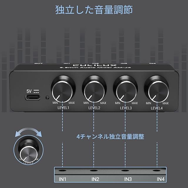 【独立したボリュームコントロール 】このミキサーは、最適なリスニング体験のために、各デバイスのボリュームを個別に調整することができます。