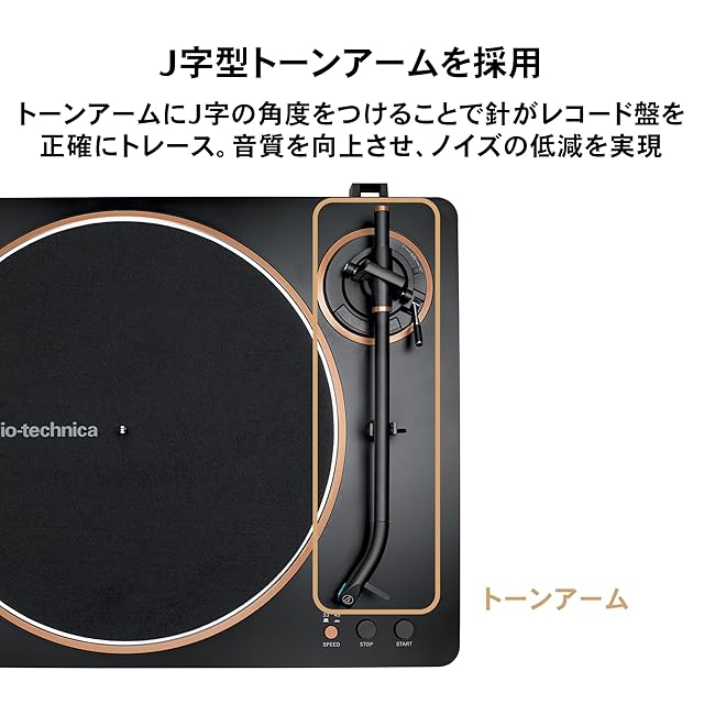 伝統のJ 字型トーンアームを採用:外側から内側に向って回転するレコ―ドの溝に対して、J字に角度をつけて比較的長いトーンアームを採用することで針先がなるべく垂直になる範囲を広くしています。これにより針がレコード盤をより正確にトレースします。