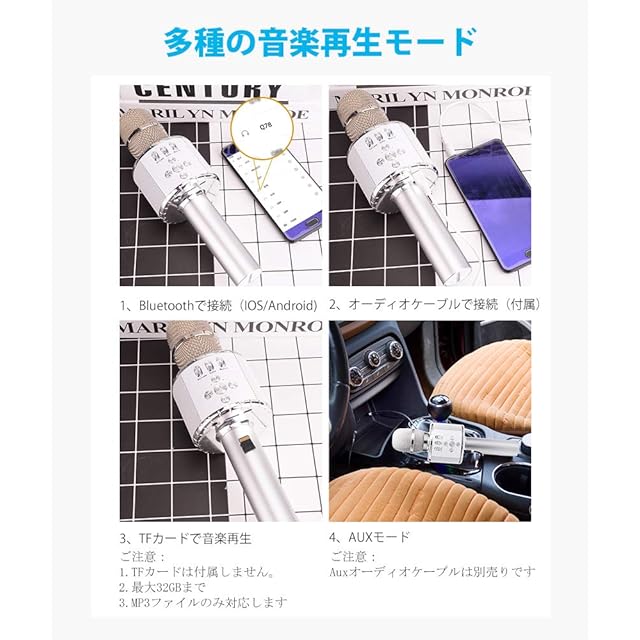 商品名:Verkstar カラオケマイク Bluetooth ワイヤレスマイク ブルートゥースマイク 録音可能 LEDライト付き&イヤフォンジャック付き TFカード機能 Android/iPhone/PCに対応 日本語説明書 シルバー