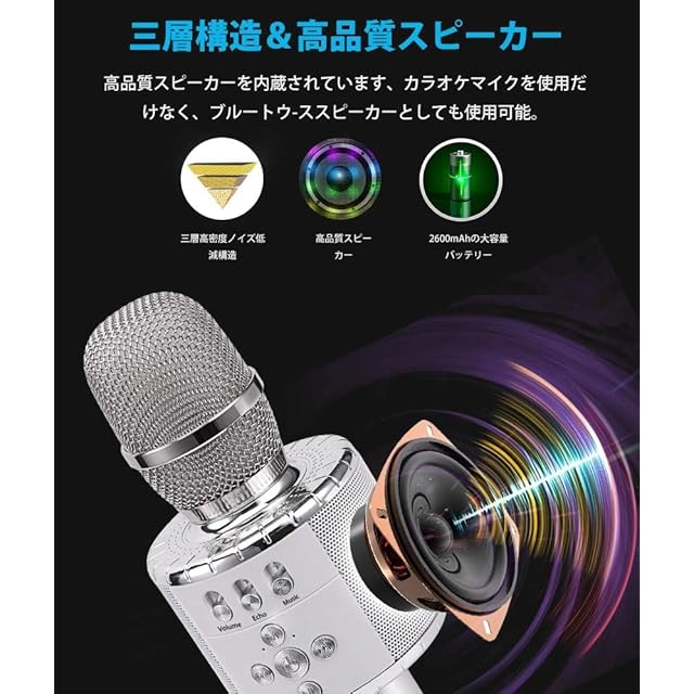 ♫【一台三役】:カラオケマイクとしてはだけでなく、高音質Bluetoothスピーカーや録音マイクとしてもご使用頂けます。ボタンを軽く押してエコー、ボリュームを自由に調整の可能です。カラオケボックスにいるかのような臨場感あふれるサラウンドを実現し、ホームパーティや新年会、忘年会、アウトドアでのイベントや花見、BBQなど様々な場合で大活躍!