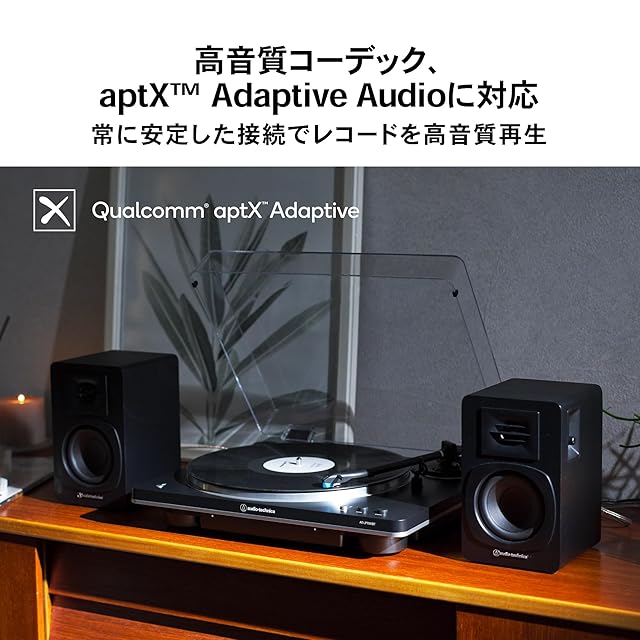技適マーク認証済み商品(周波数帯:2.4G帯) お持ちのワイヤレススピーカー/ヘッドホンでレコードの音が聴ける: 普段お使いのワイヤレスピーカーやワイヤレスヘッドホンで、レコードの⾳を聴くことが できます。Bluetoothの電波が届く範囲なら⾃由に動けるため、お部屋のリラックスできる場所で、レコードの⾳を気軽にお楽しみいただけます。周囲の電波環境や⾳楽データの転送状況に応じて、ビットレートをリアルタイムで変化させ、常に安定した接続でレコードの⾳が楽しめるaptX Adaptive Audioに対応します。