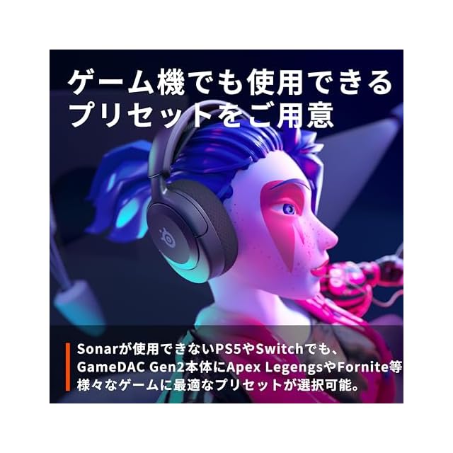 【ゲーム機でも使用できるプリセットをご用意】Sonarが使用できないPS5やSwitchでも、GameDAC Gen2 本体にApex LegengsやFornite等、様々なゲーム(現在14タイトル)に最適なプリセットが選択可能。SteelSeriesのヘッドセットをご使用いただく事で、より最適なサウンド設定を体感いただけます。