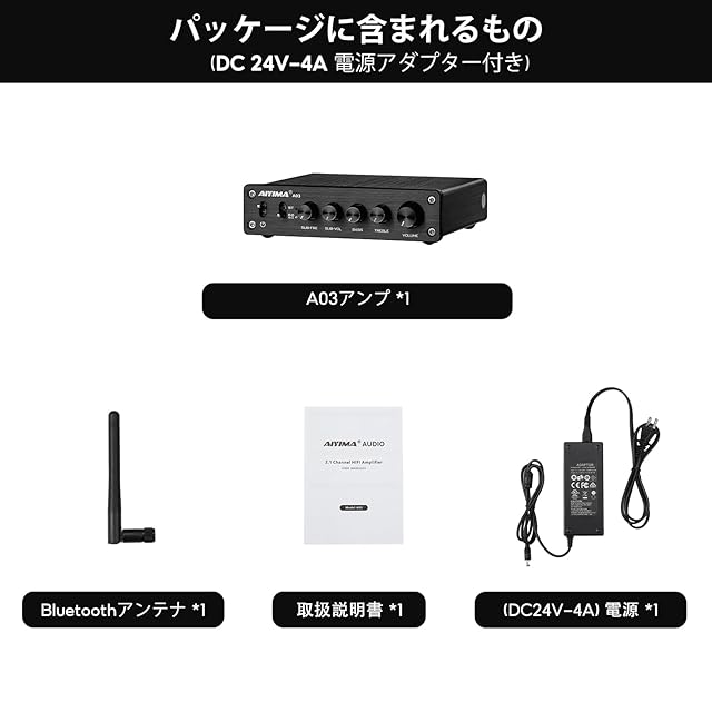 製品に含まれるもの :A03 アンプ *1 取扱説明書 *1 DC 24v 電源アダプター *1 Bluetooth アンテナ *1,期間24ヶ月。何か問題があれば、AIYIMAチームに連絡して対処することができます!