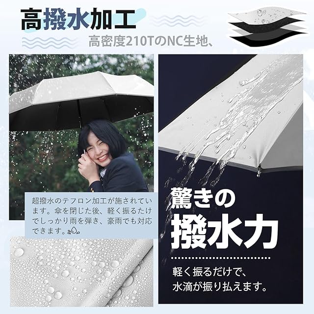 【晴雨兼用・高密度210T生地超撥水】 折り畳み日傘は210T高密度ポリエステル素材、傘布上のナノテクノロジー防水加工、通常の折りたたみ式日傘よりも優れた防水機能、雨滴は自動的に傘布で滑り落ちます,雨の後は、水滴を簡単に振り落とすことができます。天候の急変時には傘としても使用でき、晴雨兼用折りたたみ傘です,外出に便利です。傘と同じデザインの専用収納袋付きで、ゆったりしたデザインですので濡れた時でも出し入れしやすいです。