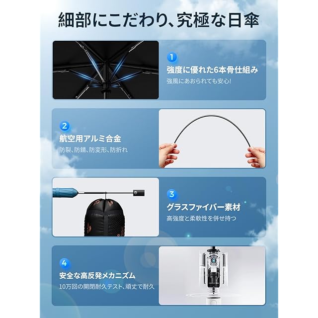 【耐久性が抜群・2年間の品質】UPEB軽量日傘は、三角形の力学構造、黄金比に近い設計、高品質で強化された素材を採用し、6級の強風に耐えることができます。コンパクトながらも、卓越した耐久性を備えており、安心して長期間ご使用いただけます。 UPEBは、長年、新技術・新製品を創造し続けています。そのために、研究開発に力を注ぎ続けています。常に業界トップクラスの品質を守り続けています。本製品は2年間の期間が付いています。万が一、商品に不具合が生じた場合には、弊社までご連絡いただければ、迅速かつ日本語で対応いたしますので、安心してご利用ください。