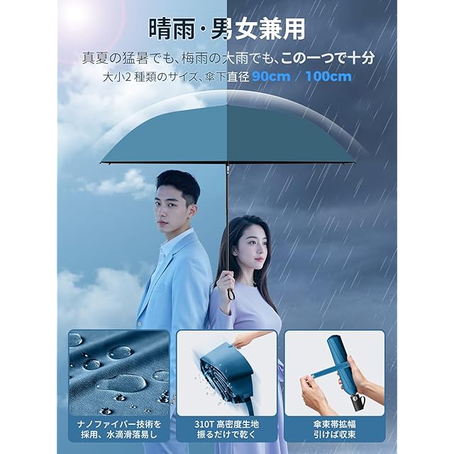 【大小2 種類のサイズ、傘下直径 90cm/100cm・9 色から選べます】90cm の小サイズは軽量で持ち運びが簡単で、いつでもどこでも風や雨を遮ってくれます。日常の通勤や買い物の際に、最適なお供となります。100cm の大サイズは、適切な遮蔽面積で、全方位の保護を提供します。突然の激しい雨でも、心配することはありません 。人それぞれユニークな個性とスタイルを持っています。UPEB が丹念にデザインした 9 色は、服との相性が良いだけでなく、それぞれ鮮明で特徴的です。傘を差して歩くすべての瞬間に、あなたが独一無二の風景になれます 。