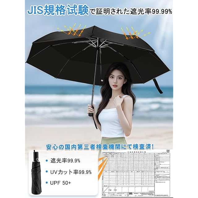 【UVカット・遮光断熱日傘】この日傘は最新の技術と製造工法を採用し、99.99%紫外線カット、光透過率0%、UPF50+の遮光傘です。二重コーティングを施し、表面は直射日光を遮断し、内側にはブラックコーティングを採用。紫外線を効果的に吸収し、傘面を通過するのを防ぐことで、より優れたUVカット効果を実現しました。紫外線(UV)による肌ダメージを軽減し、暑い夏でも快適に過ごせる必須のアイテムです。