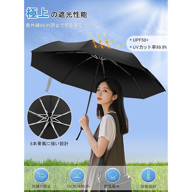 ☔【頑丈なデザイン、独自の段階的収納】高品質のバネと精密な構造を採用し、傘の骨が段階的にスムーズに折りたためるように設計されています。独自の段階的収納デザインにより、軽く押すだけで簡単に折りたたみ傘を収納でき、力を入れる必要がありません。従来の傘の収納が難しいという問題を解消し、反発の心配もありません。さらに、重量は約318gで、スタイリッシュな外観のため、男女問わずお使いいただけます。通勤、通学、旅行、ピクニック、スポーツなど、さまざまなシーンに適しています。<br>【UVカット・遮光断熱日傘】この日傘は最新の技術と製造工法を採用し、99.99%紫外線カット、光透過率0%、UPF50+の遮光傘です。二重コーティングを施し、表面は直射日光を遮断し、内側にはブラックコーティングを採用。紫外線を効果的に吸収し、傘面を通過するのを防ぐことで、より優れたUVカット効果を実現しました。紫外線(UV)による肌ダメージを軽減し、暑い夏でも快適に過ごせる必須のアイテムです。<br>☔【晴雨兼用&8本骨の強靭な構造】この折りたたみ傘は高密度210T防水素材を採用し、優れた防水性能を備えています。高耐久性の8本骨デザインにより、強度が向上し、優れた耐風性能を発揮。強風時でも安心して使用できます。さらに、傘面の展開面積が広く、より効果的に日差しを遮り、雨を防ぐことができ、持ち物も含めた全方位の保護を実現します。<br>【ワンタッチ自動開閉・軽量&携帯便利】ワンタッチ自動開閉デザインにより、片手で簡単に操作可能。力を入れずにスムーズに開き、折りたたみも楽々。乗り降りの際も片手で素早く開閉でき、忙しい日常のあらゆるシーンで便利かつ効率的に使えます。コンパクトで軽量設計のため、通勤バッグや車内にも簡単に収納でき、突然の天候変化にもすぐに対応可能。晴れの日も雨の日も、いつでも頼れる必携アイテムです!<br>【品質&安心サポート】 万が一、初期不良や破損があった場合でも、全額返金・交換対応をいたします!(「注文履歴」→「出品者に連絡」から弊社までご連絡ください。)ご購入後のサポートも充実しており、100%の満足をお約束します。安心してお買い求めください。