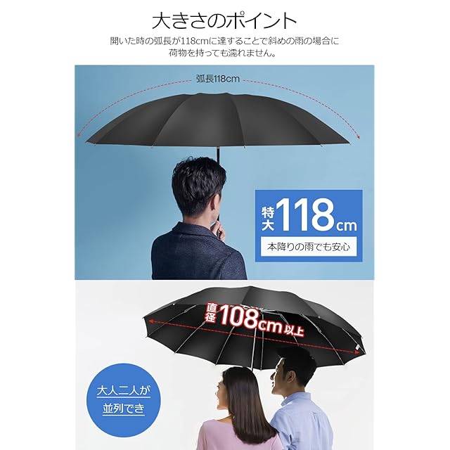 【濡れにくい大判折りたたみ傘】開いた状態で直径約108cm、曲面約118cmもある大きさで、通常の紳士傘に比べて、傘を差しながら荷物を持っていてもリュックを背負っていてもしっかりカバーしてくれて、ほとんど濡れません。体の大きな男性も窮屈さを感じることなく快適に使えます。折りたたむと長さ約32cmとなり、急な雨に備えてカバンなどに簡単に収納できます。