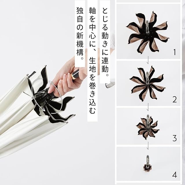 【きれいに畳む手間のない日傘/16本骨】ベルトがなく、とじるだけで、生地がまとまるShupatto アンブレラから、日傘が登場。折りたたみ傘特有の、生地を丁寧に畳んでボタンを留める作業がないので、建物や日陰の出入りもスムーズにできます。
