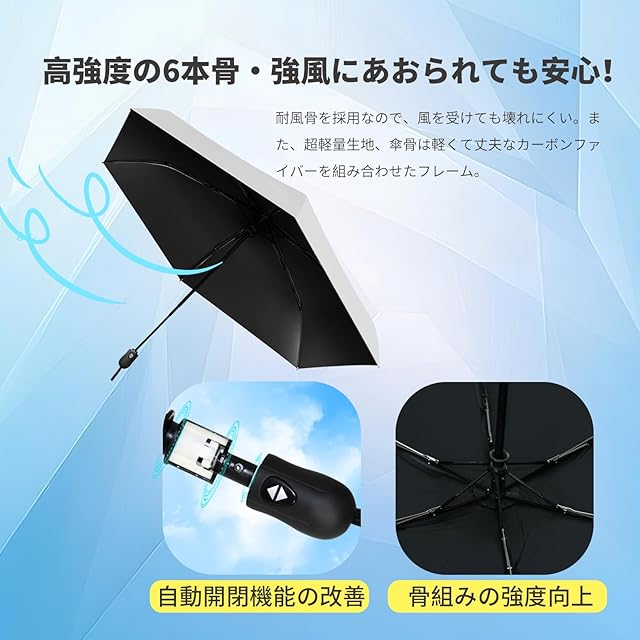 【折りたたみ傘】折りたたみ式傘は柔軟性と強度を併せ持つ繊維材料を採用しており、強度に優れた6本骨組みの設計で耐風性とコンパクトともに向上させた!強い風にあおられても折れたり曲がったりしにくいし、万が一吹かれて折れにしても、裏返ってすぐ簡単に元に戾ります。