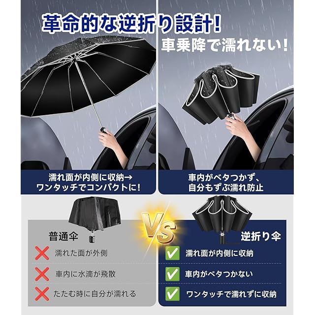 【逆折り式×超撥水で電車マナー革命】 「傘を畳むたびに周囲がビショ濡れ...」 そんな罪悪感とお別れを。当製品は業界が注目する逆折り式設計を採用。雨仕舞い時に濡れた面が内側に閉じ込められるため、満員電車でも周囲を濡らす心配ゼロ。高密度ナイロン生地に施したダブルテフロン加工が水滴を玉のように弾き、軽く一振りで水切れ完了。タクシー乗車時も座席を汚さず、オフィスエントランスで水滴を垂らす恥ずかしい事態も防止。ビジネスマンの品格を守るたった1本。