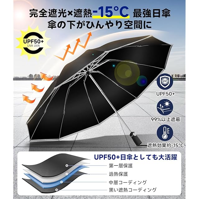 【遮光99%×UVカット99% 3D冷却効果】 灼熱のビジネス街を涼やかに歩くハイブリッド日傘。JIS規格(L0905)適合の3層遮光構造(外側:銀反射コート/中間:UV吸収層/内側:ブラックアウト)が、可視光線99%・赤外線95%をカット。傘内温度を最大7℃低下(第三者機関検証済)させる断熱エアポケット効果で、汗だくでオフィス到着する憂鬱を解消。紫外線透過率0.1%以下(UPF50+相当)ながら重さわずか425g。雨傘として使っても遮光性能は持続します。