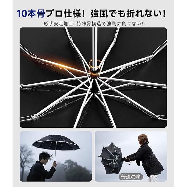 商品名:【逆折り式10本骨】折りたたみ傘 ワンタッチ自動開閉 メンズ レディース兼用 耐風・豪雨対応(台風対策可)広幅105cm大きい 反射テープ付き 遮光99%・UVカット99% 男子日傘 テフロン加工 折り畳み傘 収納ポーチ付き 晴雨兼用 梅雨対策 丈夫耐久 ブラック