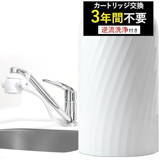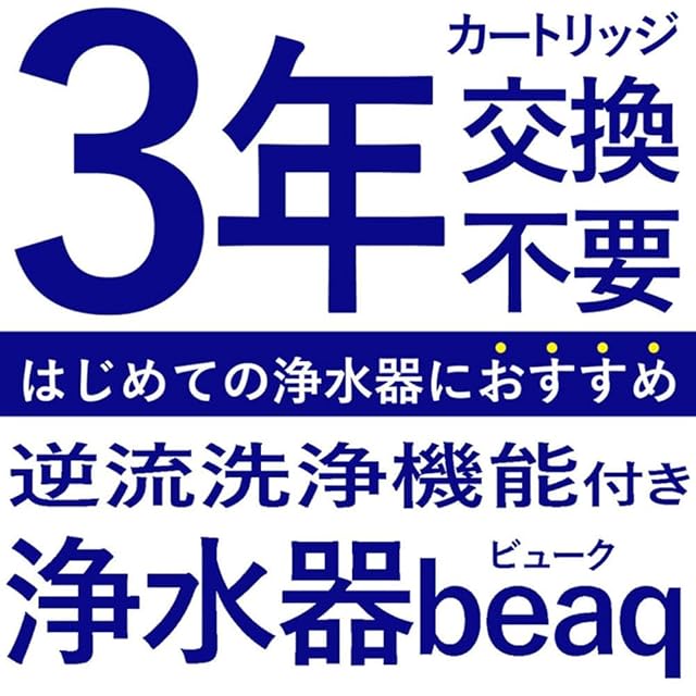 残留塩素除去36,000リットル!<br> 3年間カートリッジ交換不要<br> 遊離残留塩素+その他19項目の不純物を除去!<br><br> ★おかげさまで、シリーズ累計100,000台突破★<br> 岐阜県の浄水器メーカーがつくる据置型浄水器<br><br> 浄水能力は各国の認証機関が証明しています。<br> ■国際基準NSF認証を取得した活性炭を使用<br> ■食品衛生法適合部材を使用<br> ■厚生労働省告示第370号<br> ■水道法に定める厚生労働省101号 水質基準に適合<br> ■飲料水水質検査、環境証明事業登録機関による水質基準に適合<br><br> 01,逆流洗浄付き<br> 逆流洗浄で水道水に含まれる塩素本来のチカラを活用。<br> 菌の繁殖を低減し、清潔な状態を保ちやすくします。<br> 『カートリッジの目詰まりの解消』はもちろん、<br> 『ホース、切替コック内の水垢・ぬめりを抑制』させます。<br><br> 02,高性能W活性炭<br> 最新型の高性能W活性炭(ヤシガラ粒状活性炭・<br> 繊維状活性炭)により、有害物質を広範囲に素早く除去。<br> 約3年という長寿命を実現しました。<br> 03,美味しさを追求<br> 3種の天然鉱石(麦飯石・トルマリン鉱石・医王石)パウダーを<br> カートリッジに練り込み、美味しさを追求。<br> 天然のミネラル成分が水本来のおいしさを引き立てます。<br><br> 04,水のプロも絶賛<br> アクアデミア校長・アクアソムリエの山中先生より<br> 「雑味が無くておいしい。甘みがあり、<br> すっきりしている!」とご好評を頂きました。<br><br> 05,取り付け簡単<br> コックとホースをつなぐだけの簡単3ステップ作業。<br> 工具は一切不要です。<br><br> 06,こだわりの実用性<br> ワンタッチでレバーを切り替えるだけの簡単操作で<br> 3種類の水流を自由に選べます。<br> 料理中でもすぐお湯が使えるように、<br> 50℃まで使用可能。部品が少ないシンプルな構造なので洗浄も簡単。<br><br> 07,PFOS/PFOA除去<br> ビュークは有機フッ素化合物であるPFOS/PFOAも除去します。