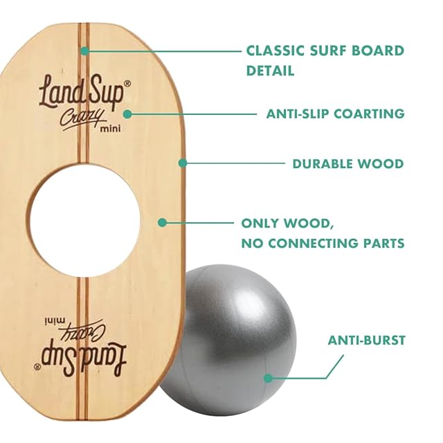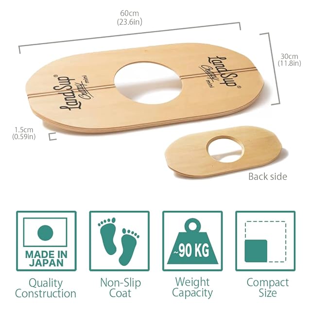 木製の陸上版サップボード「LandSup(ランドサップ)」ミニバージョン。 かわいいサイズですが揺れは予測不可能。 室内外問わず、 日々の体幹トレーニングに、 横乗りスポーツのオフトレに、 楽しいトレーニングを可能にするアイテムです。 またボードとボールはセパレートになっており、 ボードの厚さはたったの1.8cm。 使わないときはちょっとしたスキマに収納が可能です。