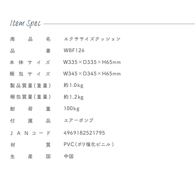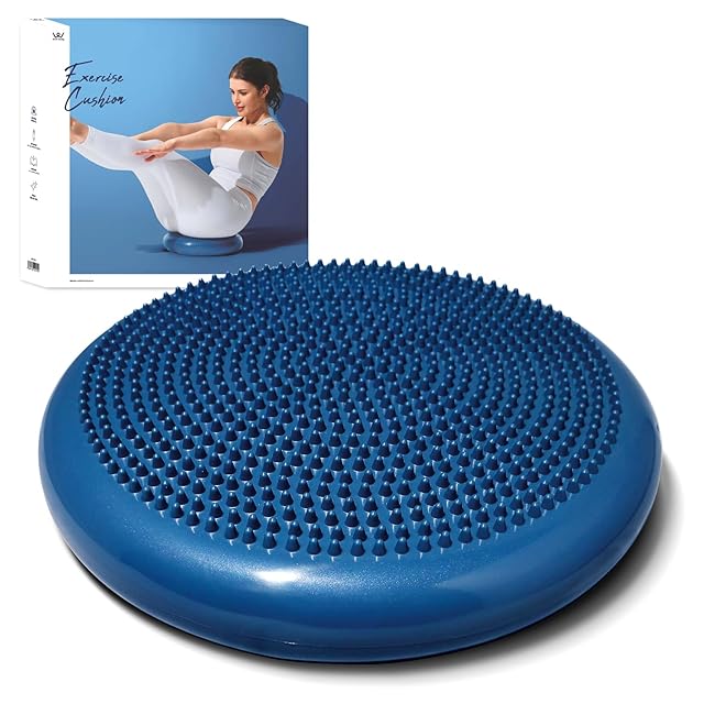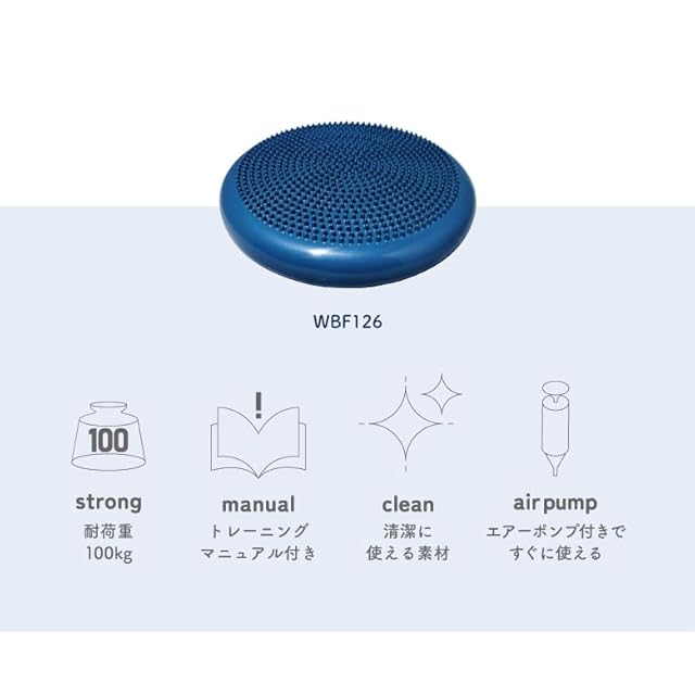 【商品仕様】本体サイズ:幅33.5×奥行33.5×高さ6.5cm/重量:1kg/耐荷重100kg/仕様:リバーシブル(突起/フラット)/付属品:エアーポンプ/トレーニングマニュアル付き/材質:PVC(ポリ塩化ビニル)/カラー:ブルー