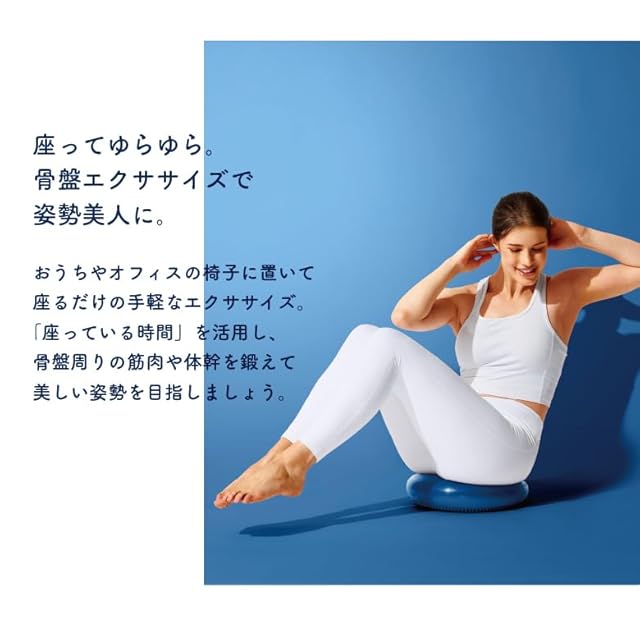 【座ってゆらゆら】おうちやオフィスの椅子に置いて座るだけの手軽にエクササイズが可能です。バランスボールと比べてミニサイズなので場所を取りません。いつもの生活に取り込みながら、無理なく、すき間時間で運動ができます。