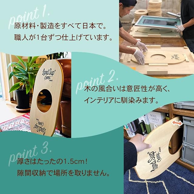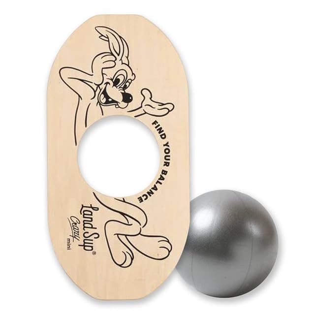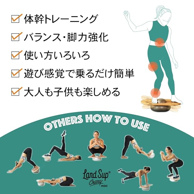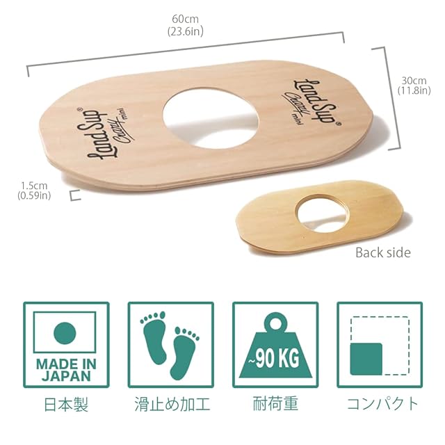 木製の陸上版サップボード「LandSup(ランドサップ)」ミニバージョン。 かわいいサイズですが揺れは予測不可能。 室内外問わず、 日々の体幹トレーニングに、 横乗りスポーツのオフトレに、 楽しいトレーニングを可能にするアイテムです。 またボードとボールはセパレートになっており、 ボードの厚さはたったの1.8cm。 使わないときはちょっとしたスキマに収納が可能です。