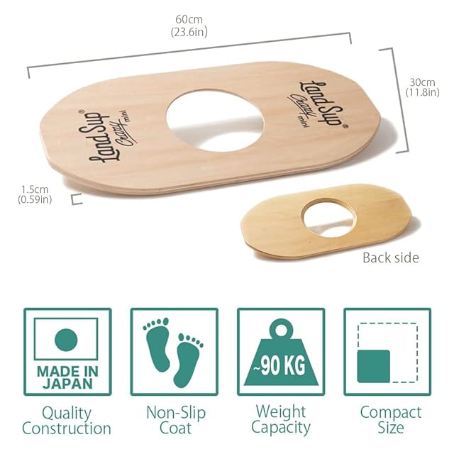 木製の陸上版サップボード「LandSup(ランドサップ)」ミニバージョン。 かわいいサイズですが揺れは予測不可能。 室内外問わず、 日々の体幹トレーニングに、 横乗りスポーツのオフトレに、 楽しいトレーニングを可能にするアイテムです。 またボードとボールはセパレートになっており、 ボードの厚さはたったの1.8cm。 使わないときはちょっとしたスキマに収納が可能です。