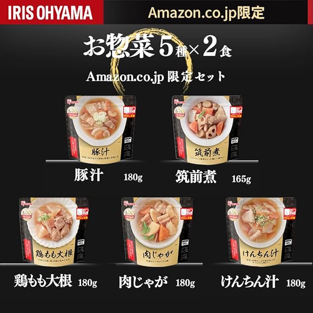 【.co.jp限定】アイリスオーヤマ レトルト食品 惣菜 5種10食 詰め合わせセット 国産 常温保存 肉じゃが・筑前煮・豚汁・けんちん汁・鶏もも大根