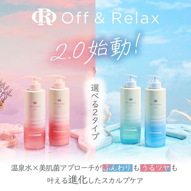 Off&Relax初のリニューアル!<br> 温泉水 × 美肌菌アプローチで『ふんわり』も『うるツヤ』も叶える進化したスカルプケア<br> <br> 〇国産温泉水を5種配合、温泉水の力でもっとうるおう髪へ<br> 従来3カ所の温泉水を配合していましたが、さらに「湯河原温泉(神流川)」と「榊原温泉(三重)」の温泉水を追加。<br> 保湿力と洗浄力がアップしました。<br> <br> 〇さらに厳選した国産植物由来成分<br> ・ムラサキ根エキス(北海道)、ウメ果実エキス(和歌山)、スサビノリエキス(瀬戸内海)、チャ葉エキス(京都)、モモ葉エキス(山梨)、酒粕エキス(和歌山)、トウモツ(香川)、ハトムギ種子エキス(北海道)、アロエベラ葉エキス(北海道)<br> <br> 〇日本と関わりの深い植物由来成分<br> ・サッカロミセス/コメ発酵液、センブリエキス、加水分解コメタンパク、加水分解ダイズタンパク<br> <br> 〇頭皮美肌菌に着目した次世代スカルプケア<br> 善玉菌を育て、悪玉菌を抑える<br> <br> ・PCA亜鉛…皮脂バランスを整える<br> ・ヒノキチオール…殺菌・抗炎症効果<br> ・マルトテトラオース…善玉菌の資源<br> <br> 頭皮にもともと存在する美肌菌(表皮ブドウ球菌をはじめとする善玉菌)に着目。新しく開発した選択制洗浄記述により、善玉菌を洗いすぎずに、悪玉菌だけをしっかり洗い流します。<br> <br> 〇もっと使いやすく! ボトルリニューアル<br> エコ設計&ユニバーサルデザインで環境にやさしく使いやすいボトル<br> ・プラスチック使用量を従来比64%削減。サステナブルな軽量ボトルに生まれ変わりました。<br> ・シャンプーのポンプに突起加工を施し、トリートメントと区別しやすくなりました。視覚に頼らず、どんなシーンでも心地よくお使いいただけます。<br> <br> <br> 『グロッシーモイスチャー』<br> ― うるおって、まとまる。髪も心もつやめく仕上がりへ ―<br> 乾燥やダメージでゴワつく髪と頭皮に、48%アップした保湿力でアプローチ。<br> 北海道産紫根エキス、和歌山県産南高梅エキス、宮古島産アロエベラなど、国産の植物由来エキスをたっぷりと。<br> ヒアルロン酸による潤いチャージと、毛髪表面をなめらかに整える独自の「See-Fly処方」で、重さを感じさせない、しっとり艶やかな髪へ。<br> <br> 『アールグレイ&サンダルウッドの香り』<br> 従来の「ザクロ&セダーウッドの香り」をアップグレード。アールグレイの香りに、果実の甘さと花々のやさしさを添えて。ラストはサンダルウッドとバニラがふんわり香り、心までときほぐします。<br> 気品とやすらぎはそっと広がる。<br>