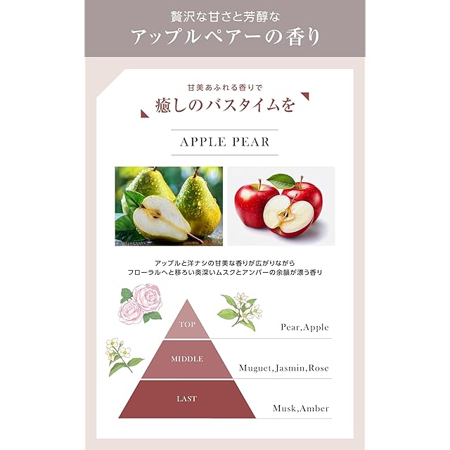 ✅【贅沢な甘さと芳醇なアップルペアーの香り】アップルと洋ナシの甘美な香りがバスルームに広がり、ジャスミン・ミュゲのフローラルへと移ろいながら奥深いムスクとアンバーの余韻が漂う。心地よさと満足感に満ちたリラックスバスタイムを。容量各390ml+120ml