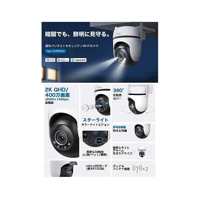商品名:TP-Link tapo 屋外カメラ WiFi ネットワークカメラ 無線/有線接続 みまもりカメラ 防犯カメラ 屋内/屋外 パン/チルト対応 スマホ アプリ 動体/人物/車両検知 2K QHD スターライト IP66 防水防塵 音声通話 Tapo C520WS/A