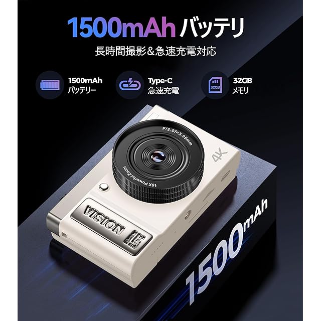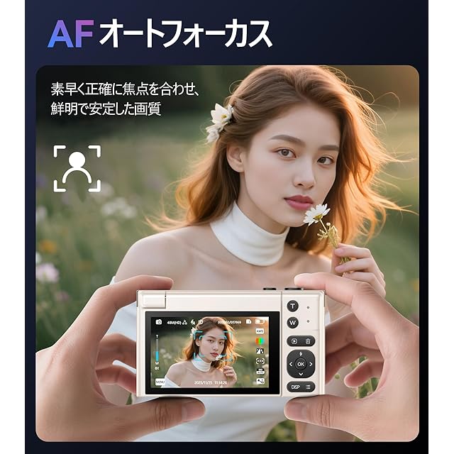 商品名:デジカメ AEKOMi 4K動画撮影 64MP画素 フリップ デジタルカメラ AFオートフォーカス コンパクトカメラ 16Xデジタルズーム 手振れ補正 3.0インチIPS スクリーン 32GB Micro SDカード付属 充電式 小型軽量 修学旅行 子供/学生/初心者に向け 日本語説明書