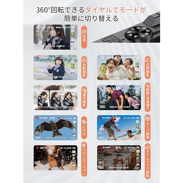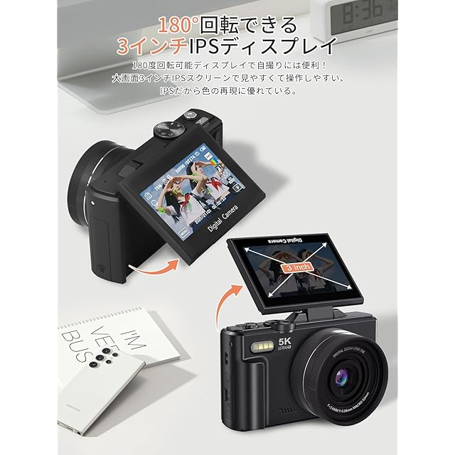 【180度回転可ディスプレイ&1200万CMOSセンサー】180度回転できるディスプレイで特別な設計により、回転するだけで簡単に切り替えて、自撮りには便利です。3.0インチIPS液晶モニターを採用しており、大画面で被写体をはっきり確認できます。また、1200万CMOSセンサーを採用されており、強力なアルゴリズムのサポートにより、被写体を明確的に識別でき、手頃な価格で鮮やかな映像を撮影できます。本体に搭載されているレンズのスペックはF値「F/2.4」、焦点距離「5.04mm」です。