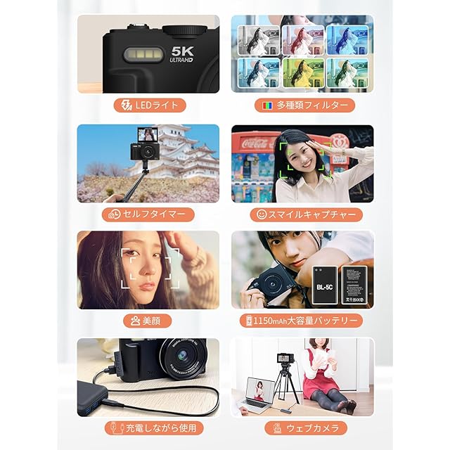 【三つのフォーカスモード&機能豊富】ピントを自動的にあわせるオートフォーカス機能、半押しで手動的にピントをあわせるマニュアルフォーカスと固定フォーカスと三つのフォーカスモードが搭載されており、ニーズによりお選びいただきますので、ぼやけることなく美しく鮮明な写真を簡単に撮影することができます。また、ビューティーフィルター、セルフタイマー、連写、スロモーションなど多彩な機能を搭載しており、初心者の方でも撮影を楽しめる4Kカメラです。高画質ビデオ通話や生放送を行うなどウェブカメラとしてもお使いいただけます。LEDライトも付属しているので、夜間や暗い部屋での撮影も簡単に行うことができます。