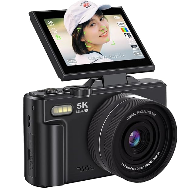 AiMike 5K デジカメ スマホに送れる デジタルカメラ WIFI転送機能 7500万画素 180度回転可ディスプレイ 64GBマイクロSDカード付き 18倍デジタルズーム オートフォーカス機能 ウェブカメラ 19種類フィルター 自撮り便利 3インチ大画面 バッテリー2枚 コンパクト 子供や初心者向け 子供の日 クリスマスプレゼント ブラック