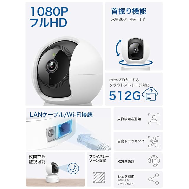 【特徴】有線LANでも無線LANでも通信できる柔軟なTapo見守りカメラが登場。フルHDで使える高コスパモデル。