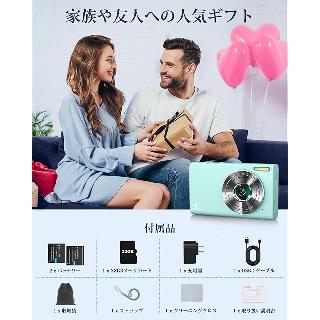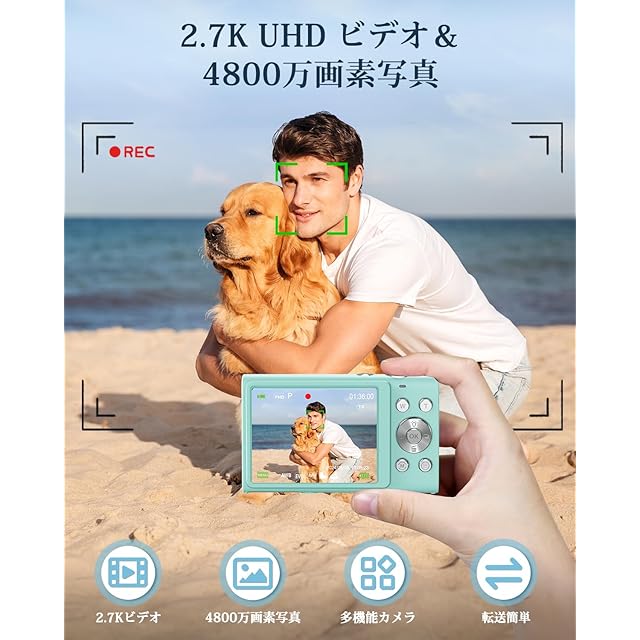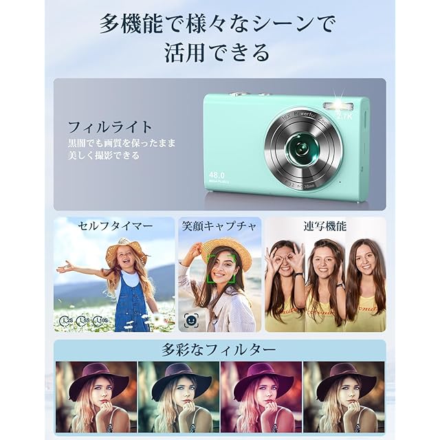 商品名:デジタルカメラ デジカメ 4800万画素 2.7K動画撮影 AF機能 3cmマクロ撮影 タイムラプス スローモーション 学生 修学旅行 子供利用可能 オートフォーカス 超軽量 初心者 セット 電池2個 32gカード付 緑