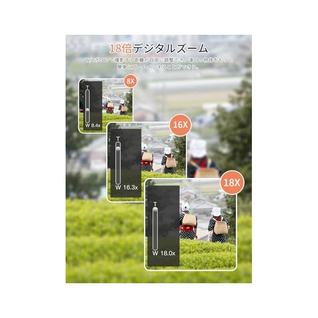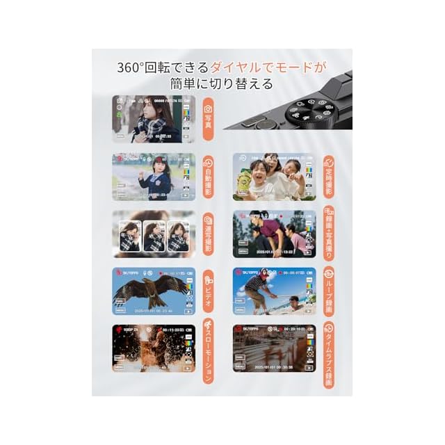 【180度回転可ディスプレイ&1200万CMOSセンサー】180度回転できるディスプレイで特別な設計により、回転するだけで簡単に切り替えて、自撮りには便利です。3.0インチIPS液晶モニターを採用しており、大画面で被写体をはっきり確認できます。また、1200万CMOSセンサーを採用されており、強力なアルゴリズムのサポートにより、被写体を明確的に識別でき、手頃な価格で鮮やかな映像を撮影できます。本体に搭載されているレンズのスペックはF値「F/2.4」、焦点距離「5.04mm」です。