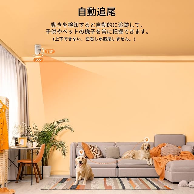 【360°全方位監視・スマホ連動・自動追尾・アラーム威嚇】この見守りカメラは、水平方向355°垂直方向115°のPTZ首振り機能、スマホ操作で遠隔からカメラの向きを変えることができます。いつでもどこでも、ペットや赤ちゃんの様子を把握できます。天井に取り付けることが可能なので、死角のない、部屋の隅々まで見渡せます。また、動きを検知すると自動に対象物を連続的に追跡しながらリアルタイムでアプリへ警報を送ります。(ご注意:上下できない、左右しか自動追尾しません。事前に追跡機能をオンにしてください。)その上に、2種類のアラーム機能を備えます。①手動アラーム:スマホで画面内の異常を見る時に手働に押すとアラームを鳴らして威嚇します。②自動アラーム(予めサイレンをオンにする必要):異常を検知すると、自動にアラームが鳴って威嚇し、不審者を撃退します。空き巣対策に効果的です。(iPhone、Android対応)(アプリ名:Canny Cam あるいは mipc、スマホのみ対応、パソコン対応不可)