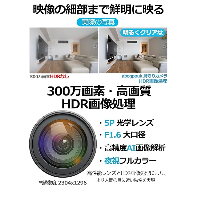 【フルHD 2K・300万画素・HDR画像処理】:高性能カメラ*2、5P 光学レンズ、F1.6 大口径、HDR画像処理、解像度 2304x1296。また、デジタルワイドダイナミックレンジ機能を備えており、逆光環境下でもクリアな映像を提供します。
