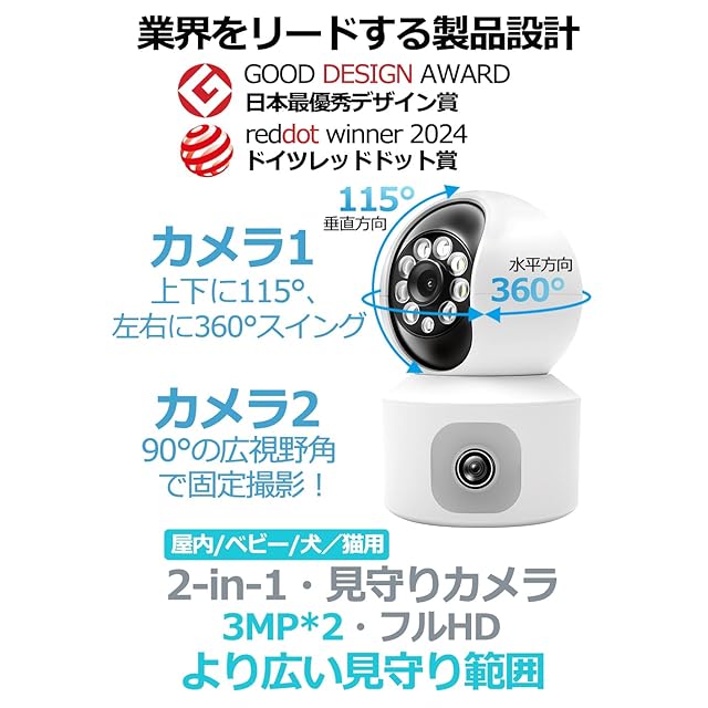 【2-in-1・見守りカメラ】:1台の見守りカメラで2カ所を同時に見守りことができる。監視カメラ画面1、スマートフォンから遠隔操作可能、上下115°と左右360°の首振りが可能で!監視カメラ画面2、90°の広視野角で固定撮影!お子様やペットの見守りに最適。