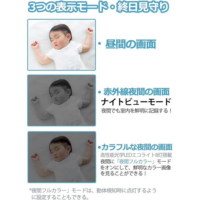 【ナイトビジョン機能・夜間フルカラー・警報機能】:赤外線-夜間や暗い場所でも映像がはっきり見える。家族の安眠を妨害することもありません。高性能光学LEDエコライト搭載-夜間に「夜間フルカラー」モードをオンにして、鮮明なカラー画像を見ることができる!警報機能-不審者を検知するとアラーム音を鳴らすことができる。自動的にビデオ録画に追従します!スマートフォンにもすぐに通知が届く。防犯機能の設定は自由に調整できます。
