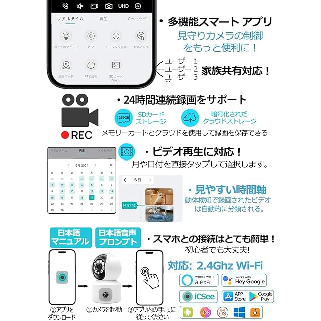 【24時間録画・最大30日間のビデオ再生に対応】:microSDカードに保存可能(256Gまでサポート)、暗号化されだクラウドストレージ。家族共有対応!2.4GHzのWi-Fi接続に対応!